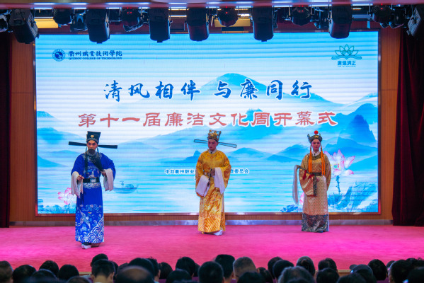 活动特邀国家级非物质文化遗产西安高腔传承人吴勤国、国家一级演员任涛,演绎大型新编婺剧《铁面御史赵抃》片段,通过衢州廉吏赵抃参劾贪腐的历史故事,让师生在非遗➕清廉的文化魅力浸润中,感受赵抃“三廉”主张及清廉事迹在当下的时代意义。