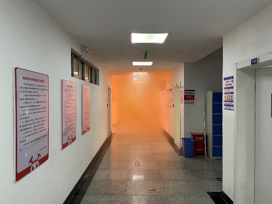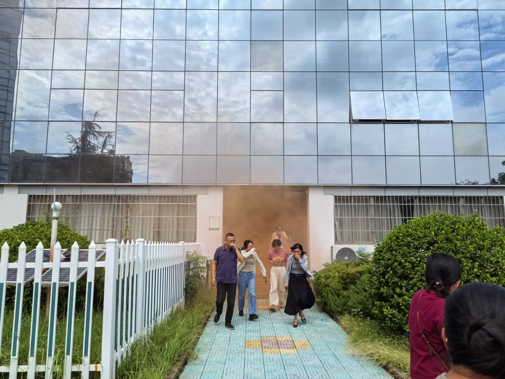 中午12:30,随着模拟火警信号的骤然响起,应急疏散演练正式开始。信息工程实训中心理工南楼一楼楼道内,浓烟(模拟)迅速弥漫。在实训中心安全管理员和各楼层引导员的统一指挥下,正在上课、实训和办公的师生员工们反应迅速,立即用湿毛巾或衣袖捂住口鼻,弯腰低姿,沿着预定的疏散路线,快速而有序地向楼外的安全集结点撤离。整个疏散过程紧张有序,仅用时三分二十秒,全体人员便安全抵达指定区域,各班级、各部门负责人迅速清点人数并上报,演练达到了预期效果。