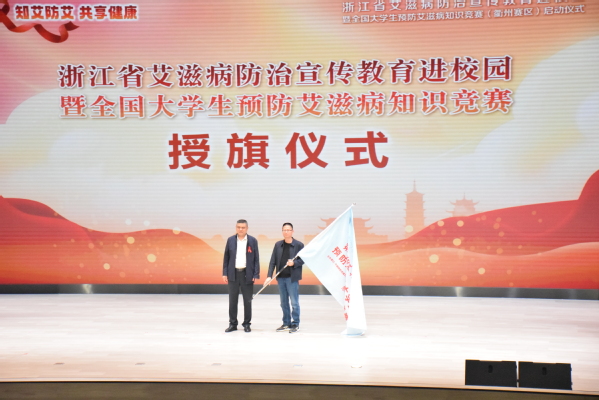 陈洪雨向衢州学院、我校授“浙江省大学生防艾志愿服务队”队旗,现场响起热烈掌声。