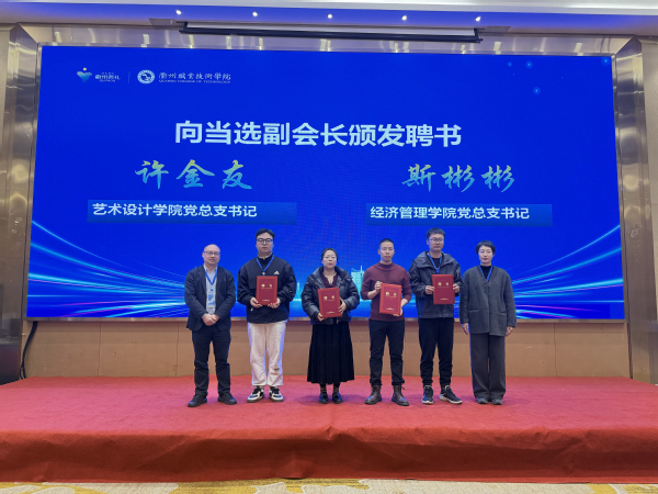 艺术设计学院党总支书记许金友、经济管理学院党总支书记斯彬彬为新当选副会长颁发聘书。
