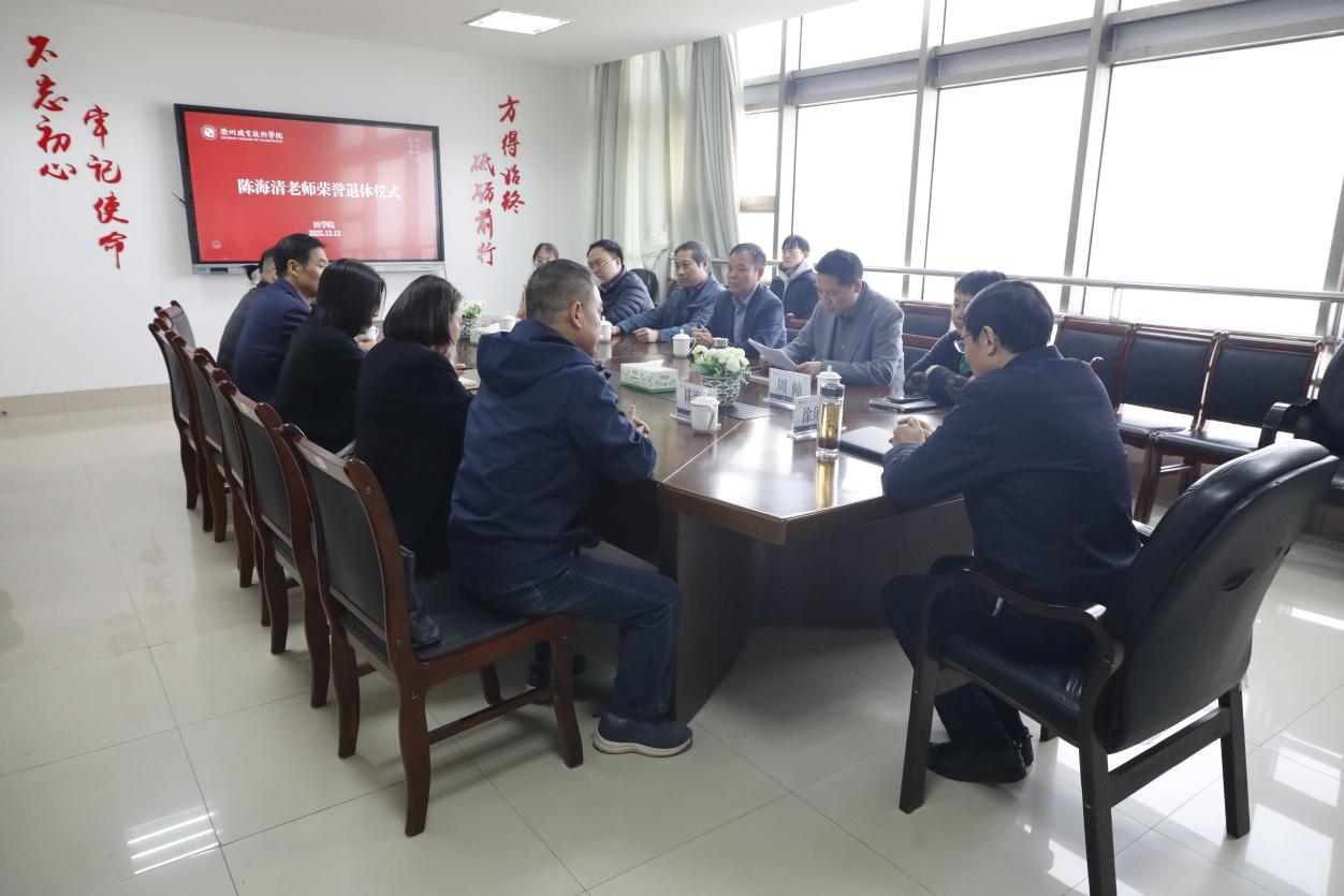 徐须实代表校党委对陈海清同志多年来在教育教学、学生管理、后勤保卫、审计监督等多岗位所付出的努力与贡献,予以充分肯定。他指出,陈海清同志政治坚定、勤勉务实,在不同岗位上始终顾全大局、恪尽职守,是学校事业发展的亲历者与推动者。他希望,陈海清同志退休后保重身体、享受生活,并继续关心和支持学校发展,为学校“新双高”建设建言献策。