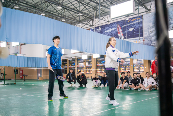 会前还开展了冠军课堂活动。黄雅琼、羽毛球世界冠军刘雨辰与学生进行了羽毛球互动教学,现场示范了发球、接发球及网前步法等关键技术动作,并结合自身训练经历深入浅出地讲解动作要领与实战策略,激发了学生对羽毛球运动的浓厚兴趣。学生们积极参与互动,现场气氛热烈。黄雅琼鼓励大家坚持热爱、科学训练,在体育锻炼中锤炼意志、提升自我,充分发挥体育的育人功能。