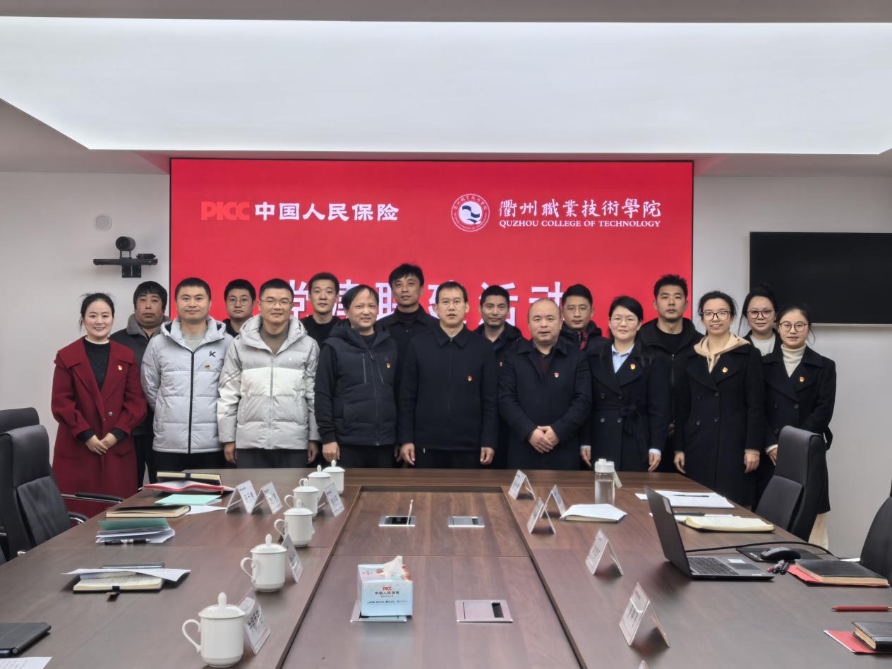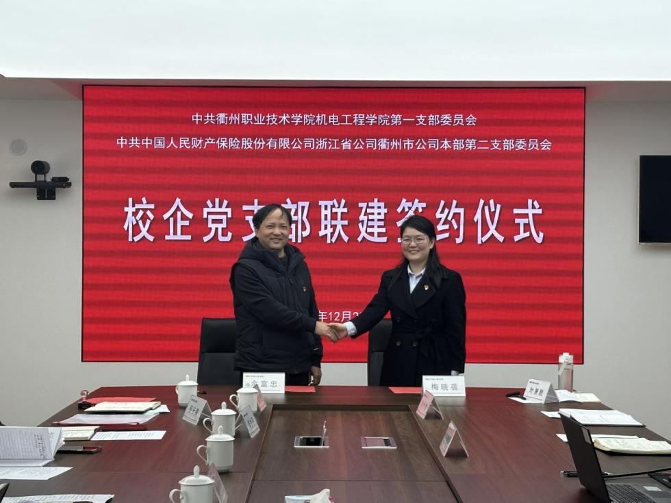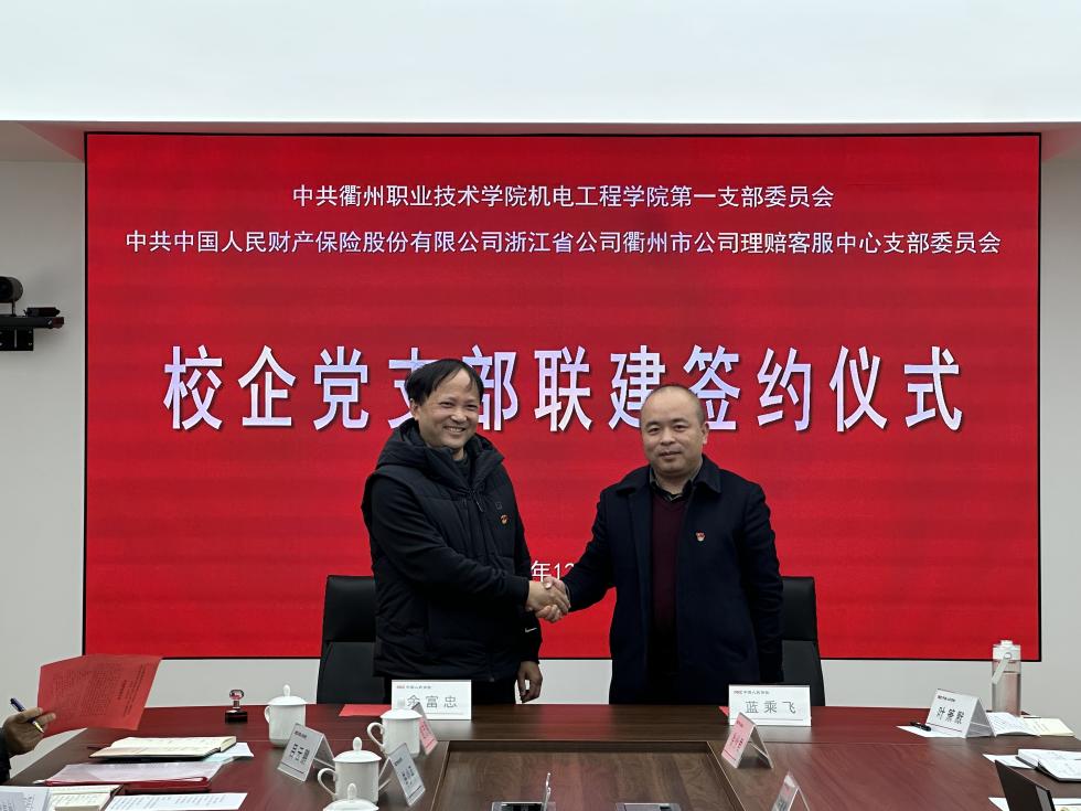 12月23日上午,机电工程学院第一党支部与人保财险衢州市分公司本部第二党支部、理赔客服中心党支部,在人保财险衢州分公司会议室联合举办“党建联建”签约活动,并同步开展校企深度合作座谈。机电工程学院院长魏小华、人保财险衢州市分公司人力资源部经理兼党委组织部部长梅晓蓓等双方党员代表参会。