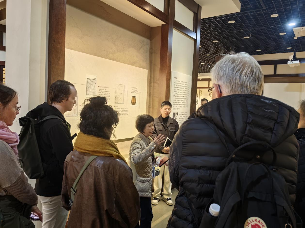志愿者们还带领留学生们参观杨继洲针灸博物馆。在博物馆序厅,留学生们体验学习了杨继洲针灸非遗文化。在针道源流板块,留学生们对针灸发展的历史渊源有了清晰的了解;在针灸铜人像前,学员们仔细观摩,详细询问当时医官院考试铜人覆黄蜡针刺出水的场景;面对展柜里悬挂着的三幅清代《铜人明堂图》以及二十四个版本的《针灸大成》,留学生们露出不可思议的神情,纷纷感叹中国古人的智慧和中医药的神奇。