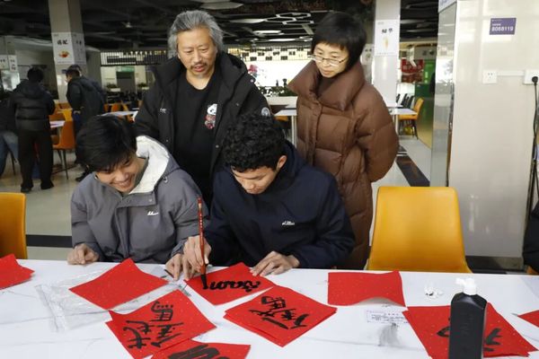 红纸铺开,墨香淡淡。留学生们第一次握起毛笔,笔尖微颤,小心翼翼描摹着“福”字的轮廓,有人用柬埔寨语写下“新年快乐”,两种文化在红纸上交叠,这一刻,团圆不分国界,祝福不拘言语。留学生们端详着自己刚写完的“福”字,笑着说:“我要贴在宿舍门上,这是我在中国过的第一个年。”