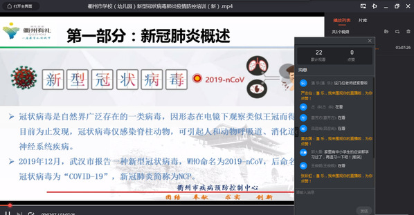 会上,教师们通过钉钉群直播观看了《衢州市学校(幼儿园)新型冠状病毒肺炎疫情防控培训》的视频,学习了校防控办下发的第6号和第10号文件等,对如何在疫情防控期间做好学生的开学准备及各项后续预防工作认真做了相关学习笔记。