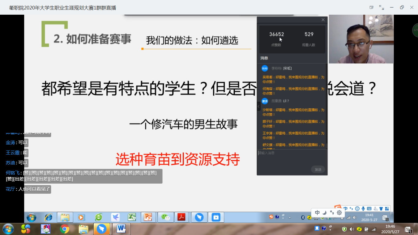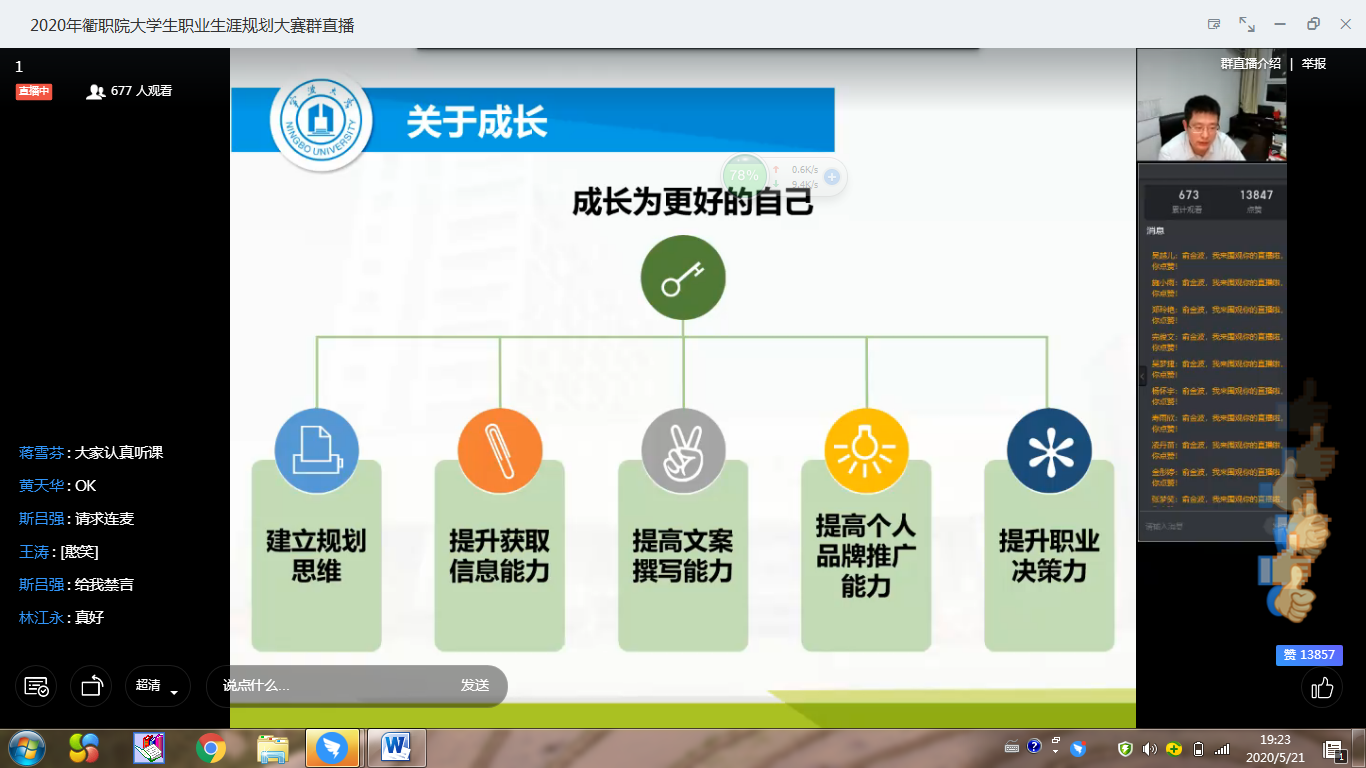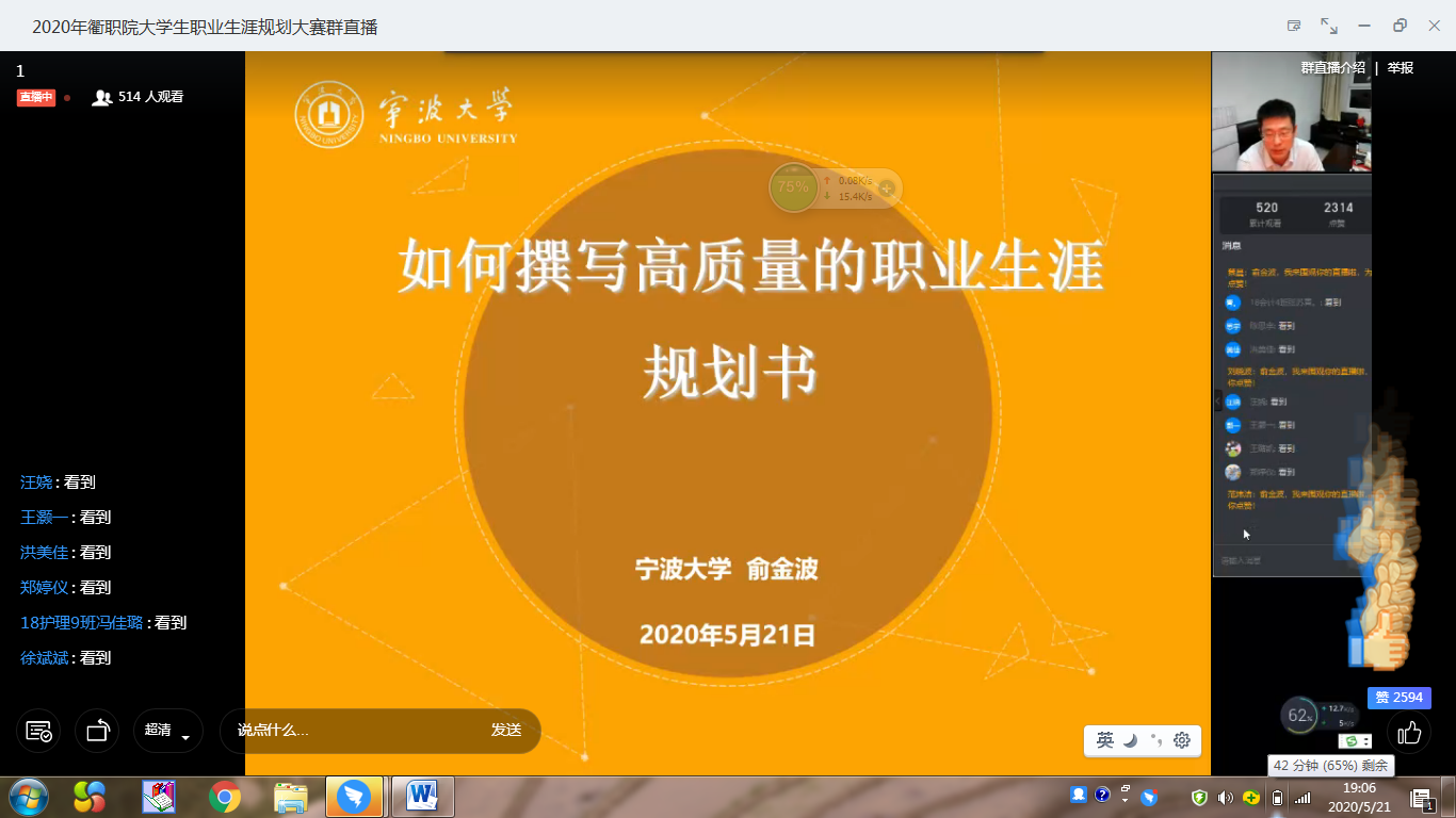 在5月21日直播过程中俞教授详细讲解了比赛的细则,文本撰写技巧以及写作过程中需要注意的问题。俞教授还引入大量职业生涯规划的案例,通过鲜活的人物分享,把大学生要建立职业生涯规划的理念贯穿始终,在直播结束后,俞教授还耐心解答师生提出的问题。