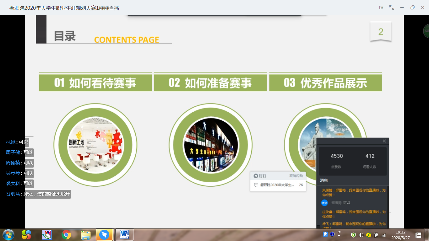在5月27日直播过程中邱处长分别从教师和学生两个视角来详细讲解大赛的特点,包括了大赛作品的遴选,大赛学生的选拔,并为我们分享了多年的参赛经验,使师生从作品的准备、打磨再到最后的现场的展示等全过程有了进一步的了解。