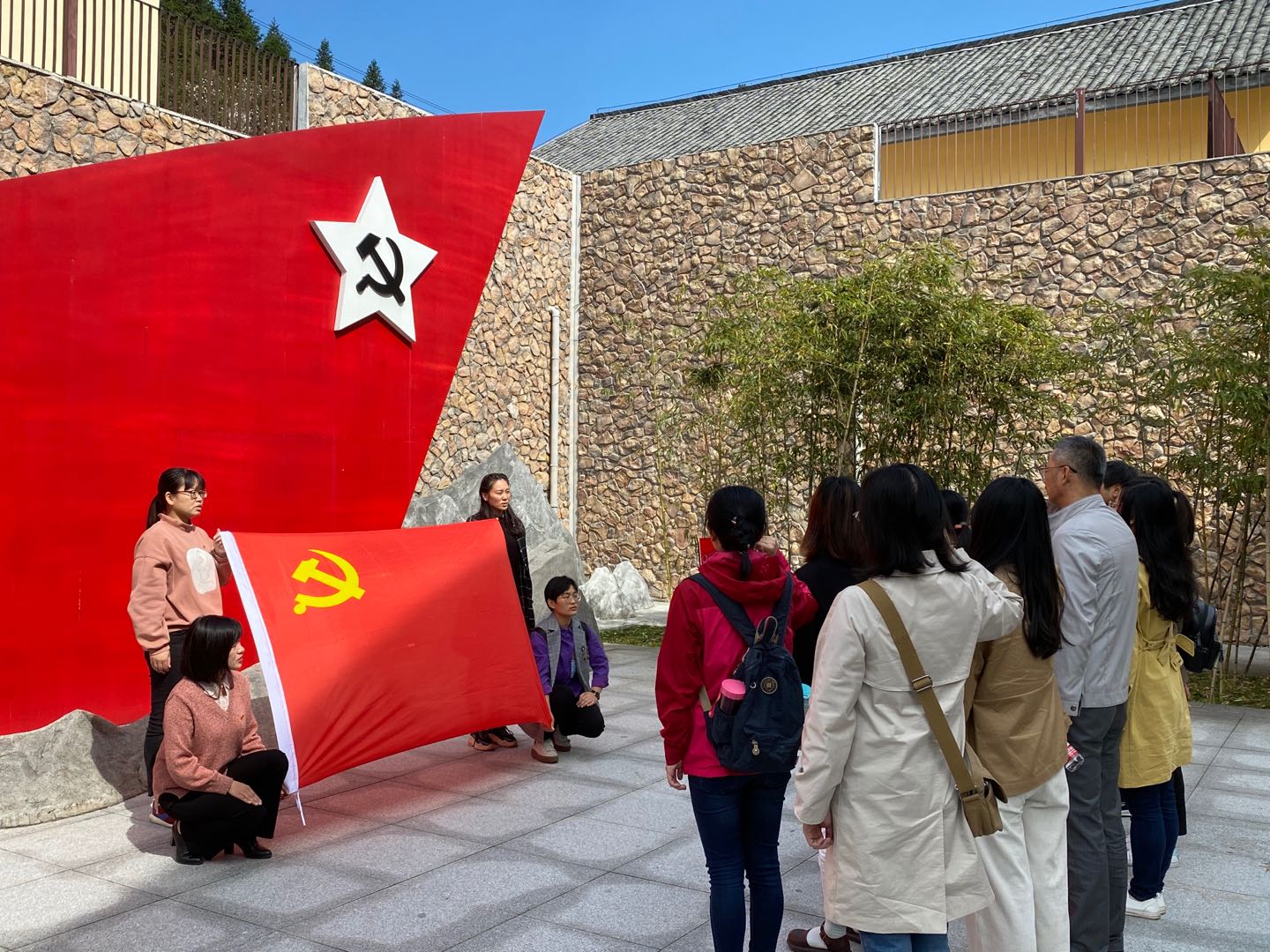 讲解参观结束后,面对着鲜红的党旗,党员们重温了入党誓词,并参观了当年党的地下武装组织活动场所。