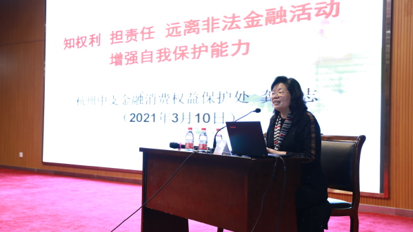 中国人民银行杭州中支金融消费权益保护处处长龚奇志给同学们作了主题为《知权利 担责任 远离非法金融活动 增强自我保护能力》的讲座,结合近期频发的新型电信网络诈骗,生动地讲解了电信网络诈骗的辨别及防范,同学们表示受益匪浅。