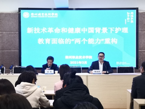 2021年3月19日下午,我校的浙闽赣皖医护康养服务能力重构研究中心主任胡野教授在医学院实训楼多功能厅作“新技术革命和健康中国背景下护理教育面临的‘两个能力’重构”的专题报告,会议由医学院院长姚水洪教授主持。浙闽赣皖医护康养服务能力重构研究中心专家及医学院全体教职工参与。