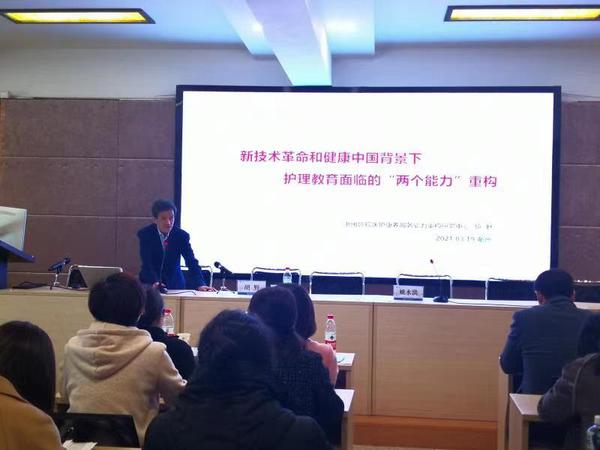 胡野教授从新技术革命推动下现代护理新变化、健康中国背景下护理新职能、护士能力发展的新趋势、护理教育教学能力重构的新要求等方面循循展开,娓娓道来,提纲挈领地指出护理教育者需要着重提高人工智能应用的能力和构建知识跨界融合能力,致力于发展全方位健康服务的能力,以此适应新时代下护理教育的发展新需求, 助力护理教育者培养出社会需要的护理实用人才。胡教授的报告为我院护理教师能力发展,护理职业能力重构提供了有益的参考和指导。
