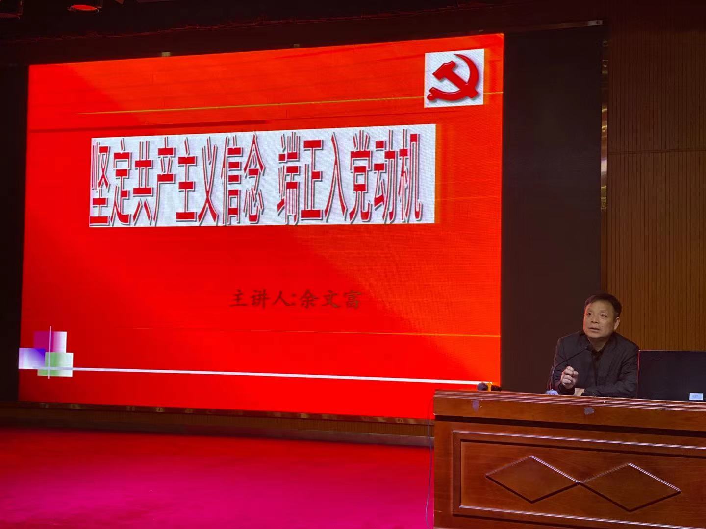 在全体起立,奏唱国歌后,医学院党总支书记余文富致辞。他以“坚定共产主义信念,端正入党动机”为主题开讲了本次培训班的第一次党课,希望师生入党积极分子从思想和行为上进一步向党组织靠拢,成为一名“有思想,有道德,有文化,有纪律”的四有新人。