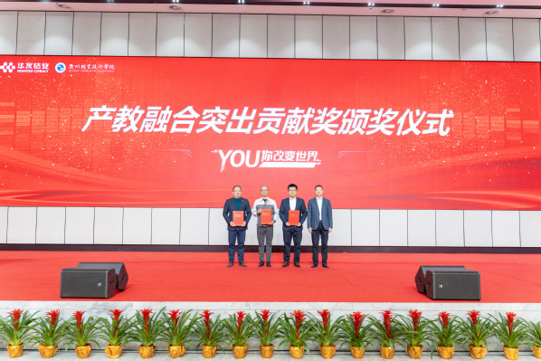 姚水洪为黄利俊、穆金泉、黄超颁发“产教融合突出贡献奖”荣誉证书。